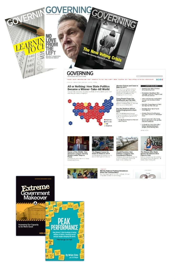 In my career as a journalist, I’ve written and edited countless pieces — from news blurbs to 7,000-word features — primarily for an audience of government leaders and public sector decision-makers. I’ve also edited two books on government management, Extreme Government Makeover and Peak Performance.